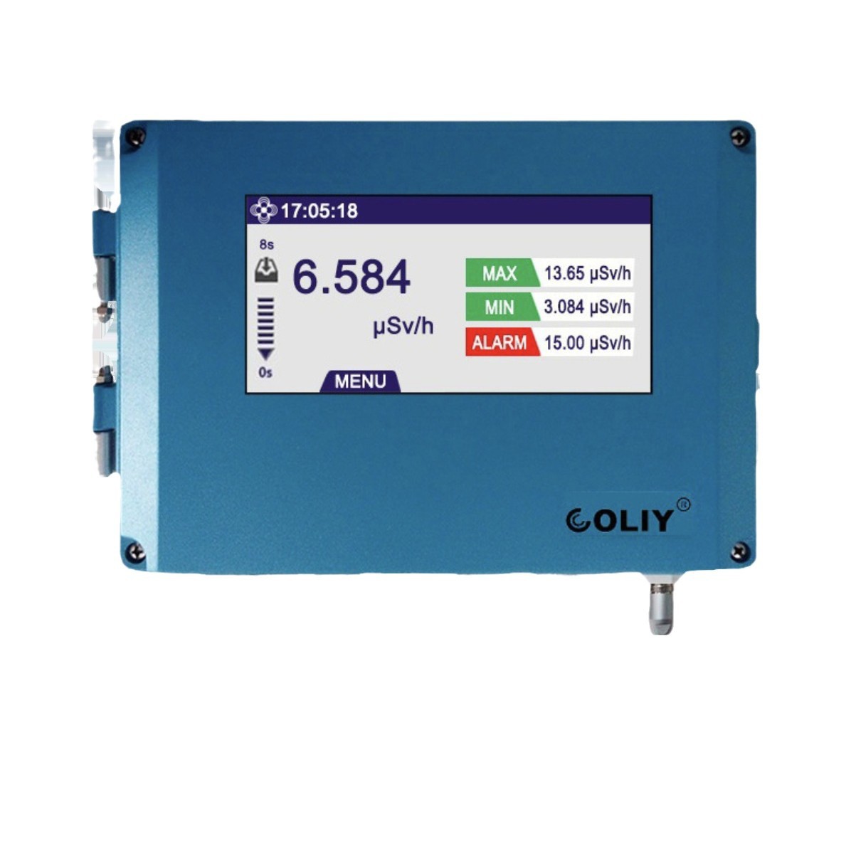德国柯雷COLIY RL20 型低能 X、γ核辐射仪 产品简介:RL20 型低能 X、γ核辐射仪,是柯雷*新研发的 于探测低能光子的核辐射仪。探头使用 NaI 闪烁体晶体作为传感器,运用高技术超薄铍窗制造工艺,并经过特殊处理,具有噪声低 本底计数低等特点。它的可探测能量下限低至 3keV, 使用于各类涉及低能 X、γ辐射的环境监测。RL20 型低能 X、γ核辐射仪主机采用 4.3 英寸高清彩色触摸显示屏,提供多种显示模式,可同时显示实时辐射剂量率值、计数率、辐射剂量累计值 大值 小值、报警阈值等多种测量数据。仪器具有大容量数据存储及数据阅读功能,可自动和手动保存辐射剂量率值,实时值与保存值可通过上位机软件上传到电脑查看、保存并分析。该辐射仪探头外壳采用高级航空铝材打造,连接电缆*长可达 20 米(需定制)。产品有欧洲 CE 认证和 ISO9001 质量认证。